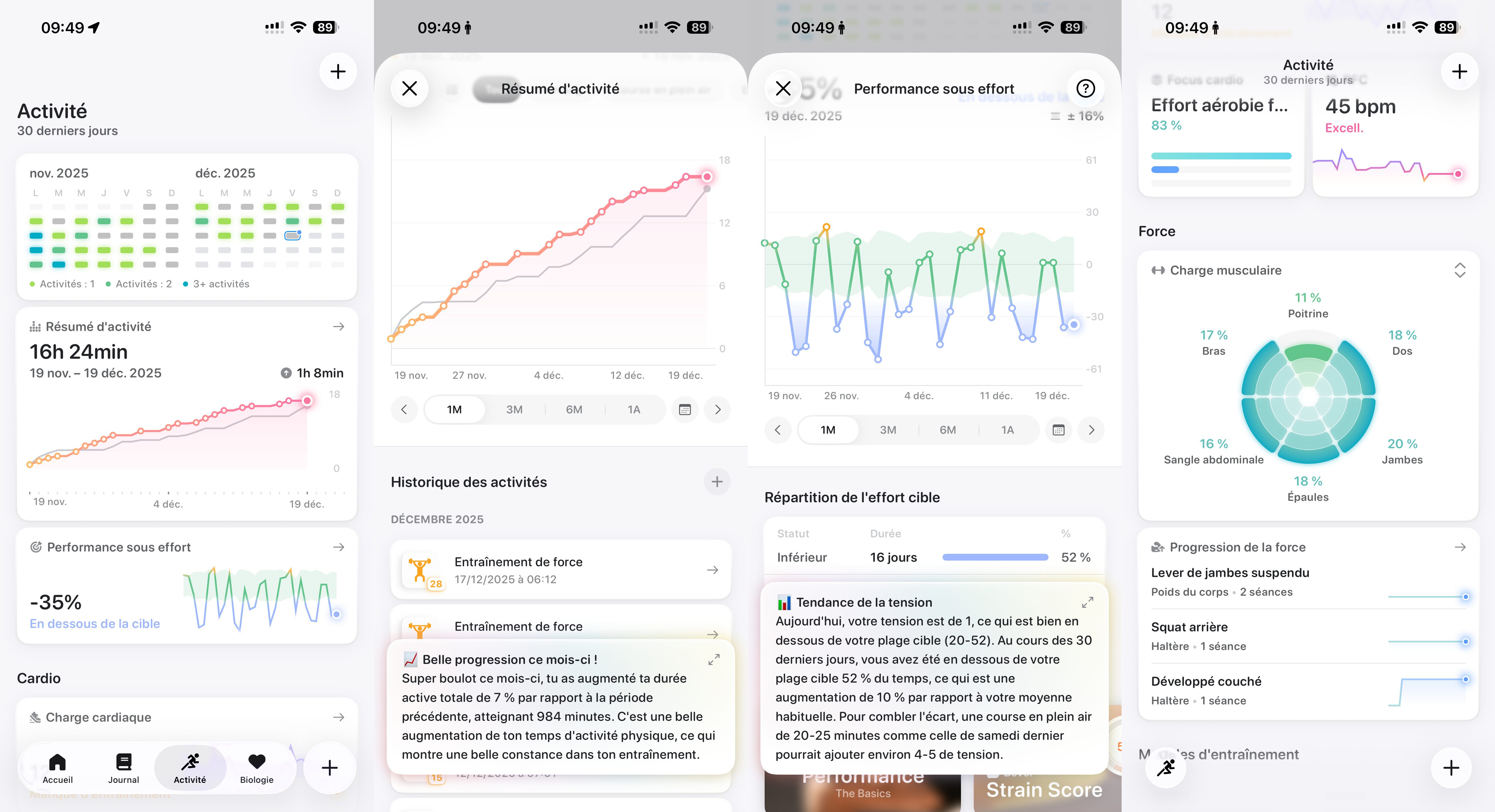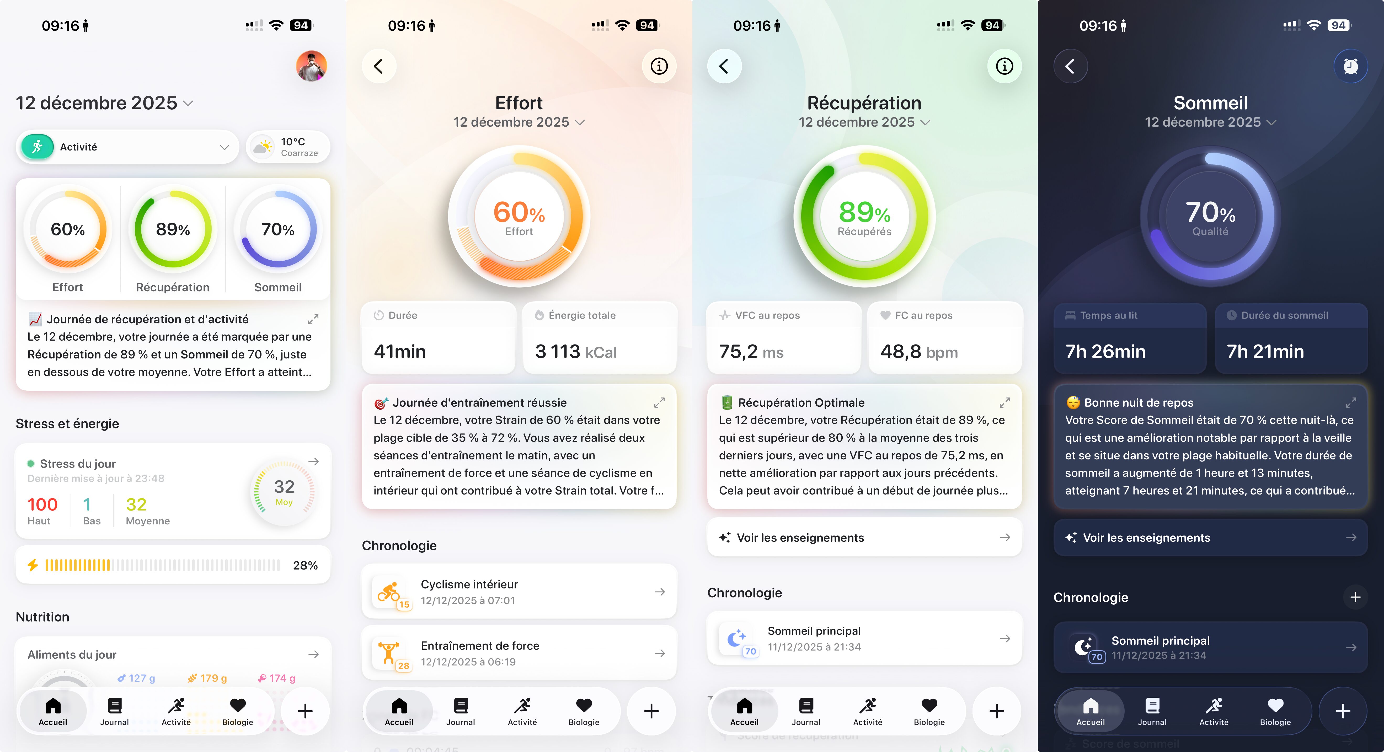En bas de page, on retrouve l’évolution des scores de récupération, les fréquences cardiaques au repos, la fréquence respiratoire, et autres saturation en oxygène. Ça permet de suivre l’évolution facilement.