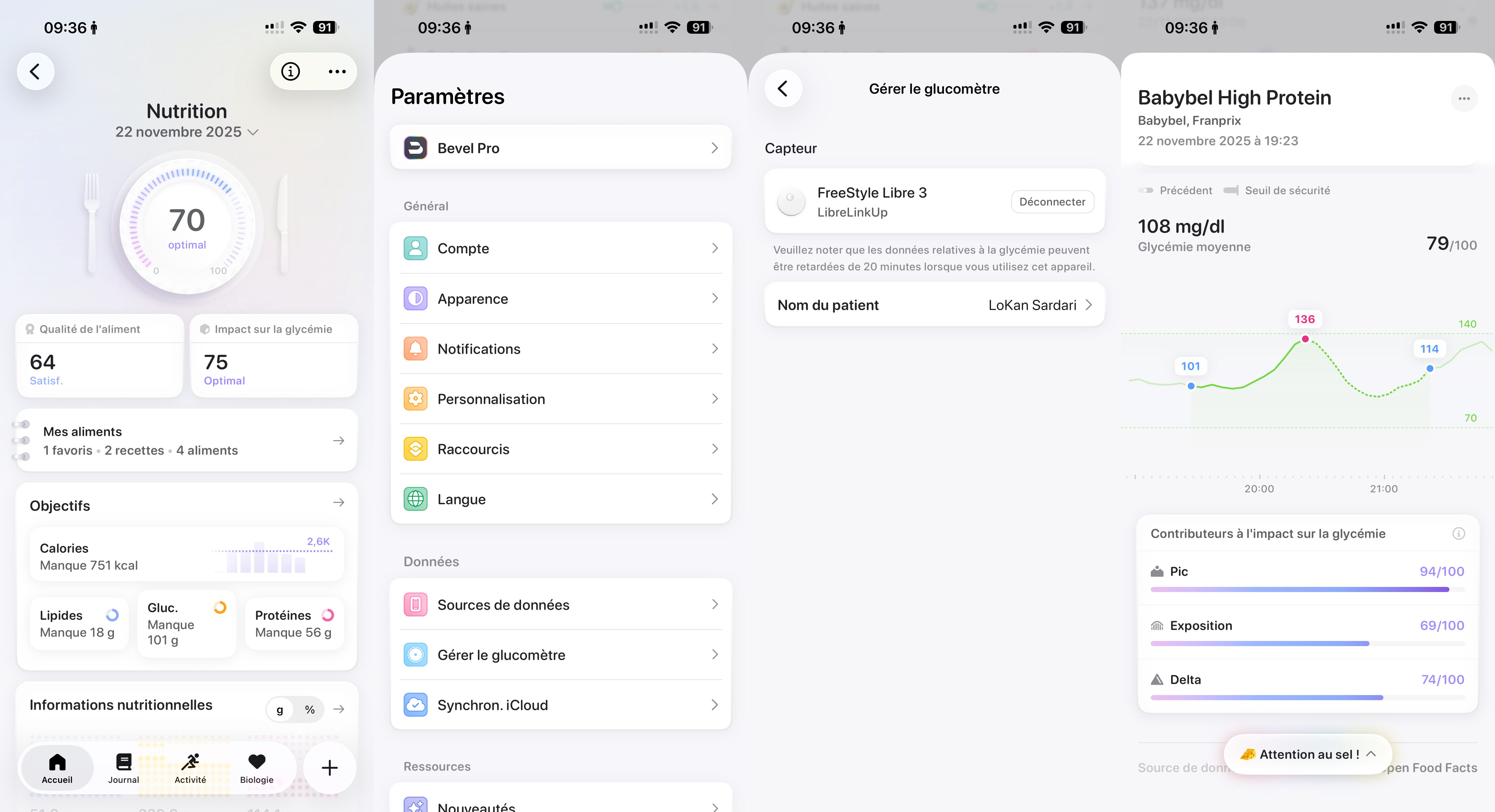 Si vous utiliser un capteur de glycémie, Bevel sait s’y connecter et corréler les données de ce capteur avec votre alimentation. L’application pourra alors impacter votre nutrition score entre la qualité de votre alimentation et la réaction de votre corps à cette alimentation.