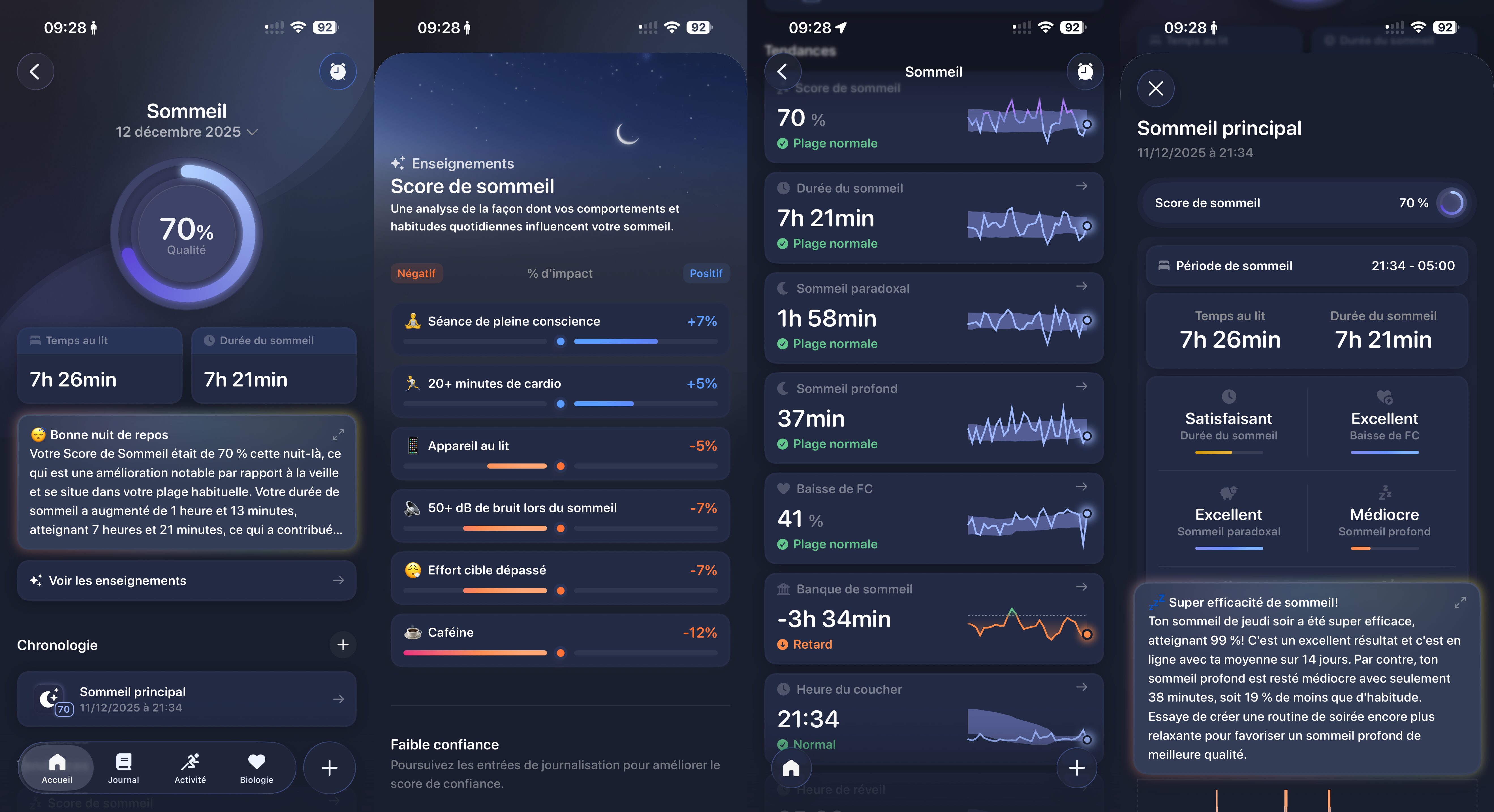 Toujours pareil, en bas de page, on retrouve tous les éléments dont on peut suivre une évolution : score de sommeil, durée de sommeil, types de sommeils, et dette de sommeil. Les horaires de coucher/réveil sont également trackées et c’est intéressant.