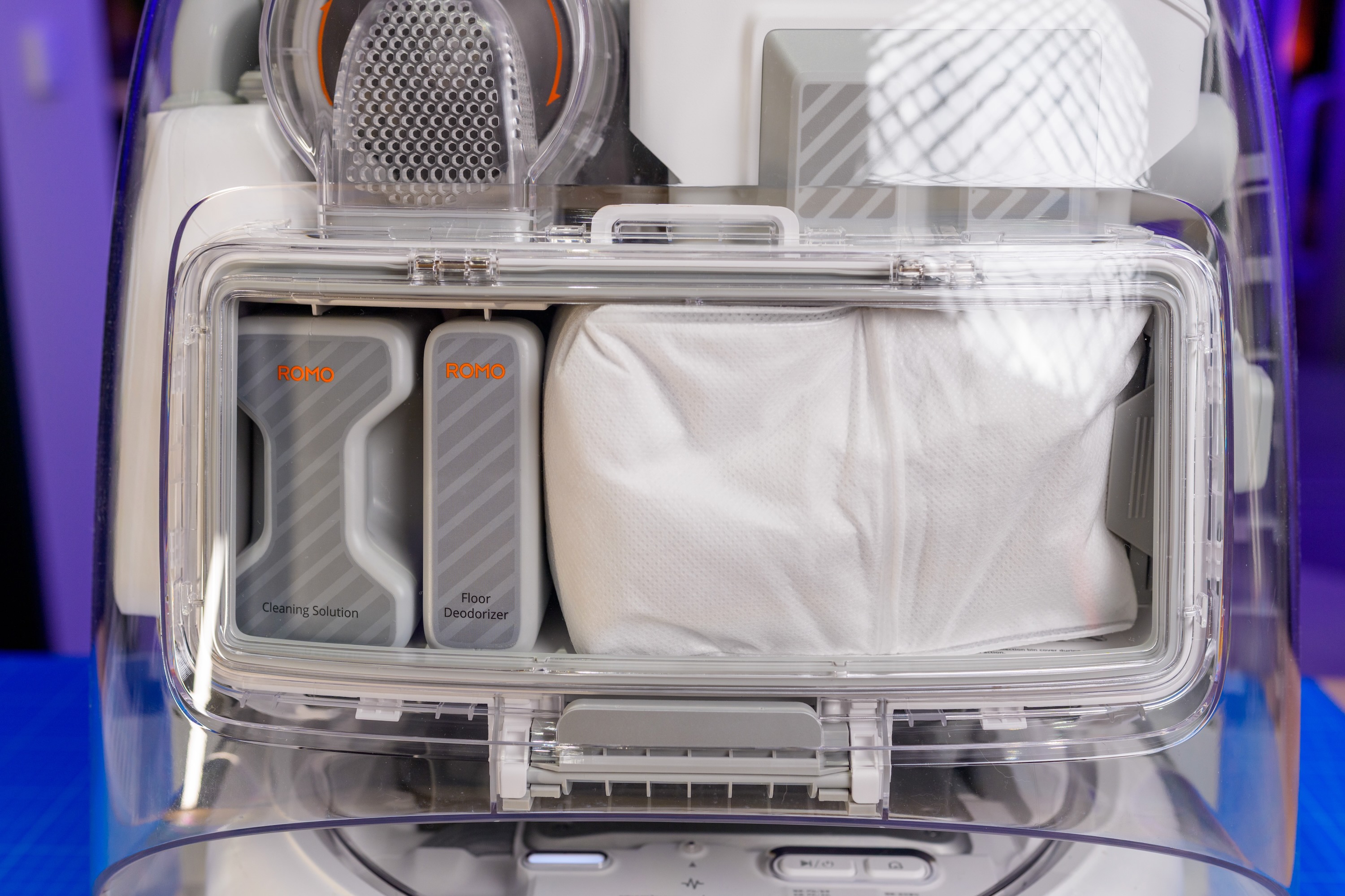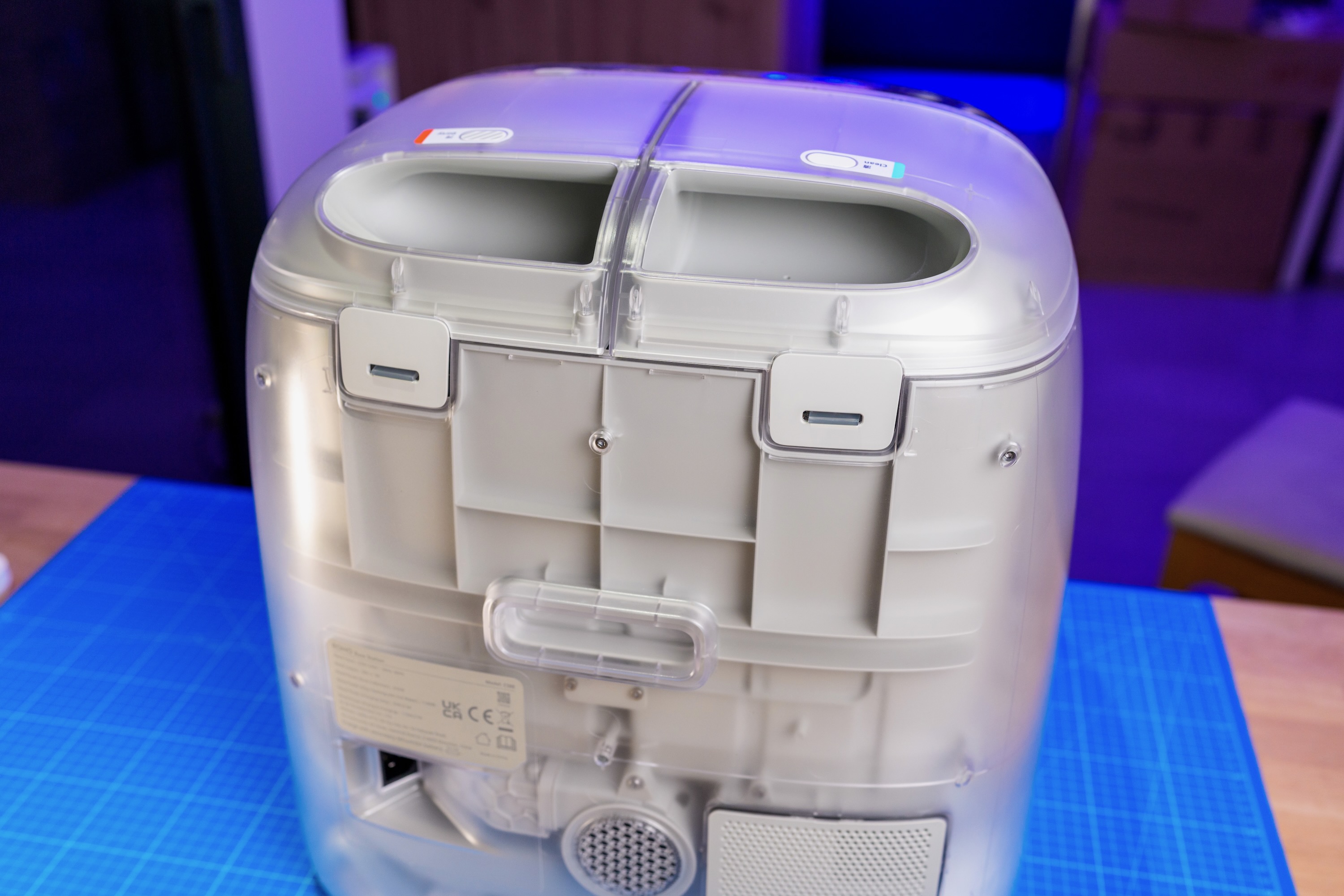 Sur la face avant, on retrouve une trappe pour les produits de nettoyage (désodorisant et dégraissant) ainsi que le sac à poussière. Autant je râle beaucoup sur le retour des sacs à poussière, autant je comprends le choix esthétique sur celui-ci.