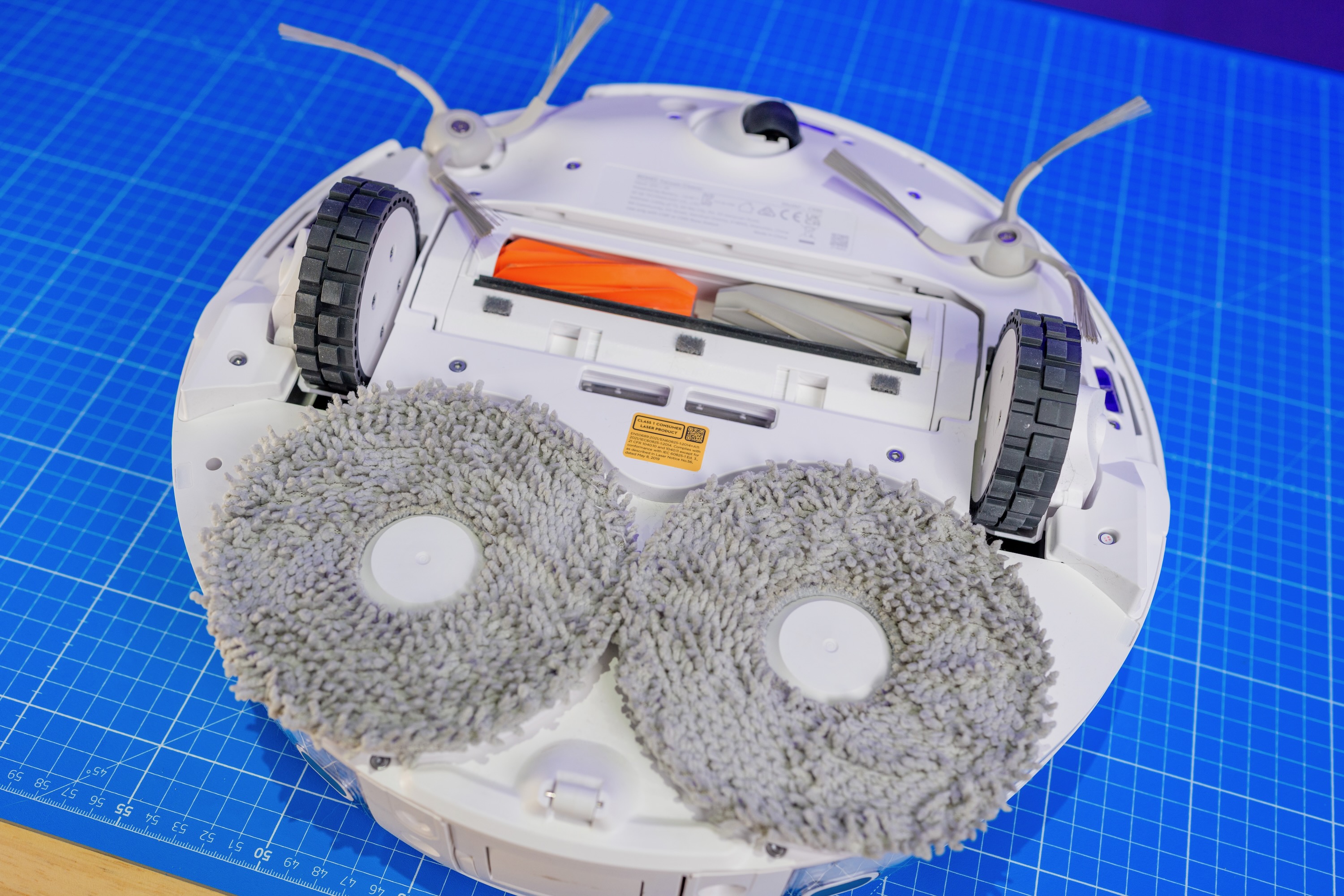 Le robot aspirateur DJI permet le lavage des sols et il est donc équipé de serpillières et de réservoirs pour l’eau propre et l’eau sale. Les deux réservoirs sont situés sur le dessus, avec des poignées très agréables pour les retirer (c’est un détail, mais ça compte). Les serpillières, elles, sont toujours présentes sur le robot : elles seront abaissées ou pas en fonction du programme.